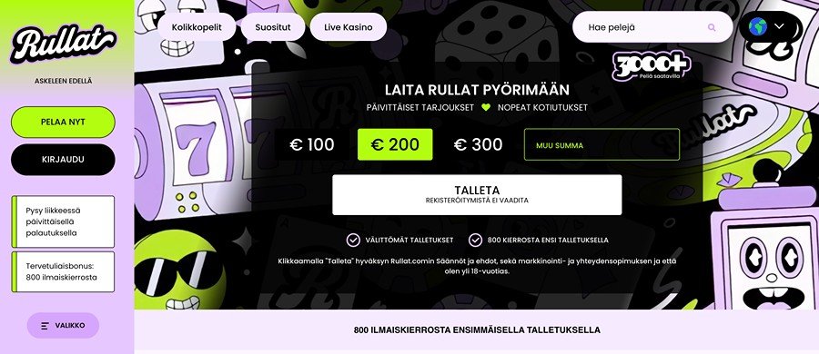 - Ilmaiskierrokset: jopa 800 kierrosta ensitalletuksella (20 € minimi)